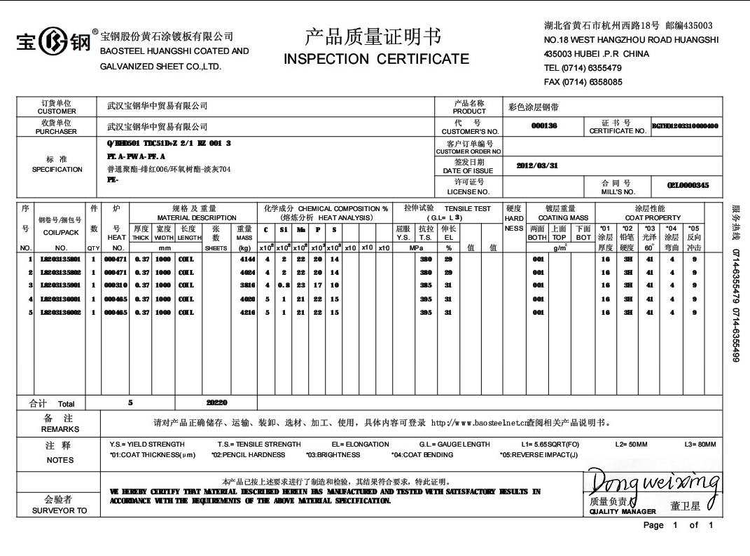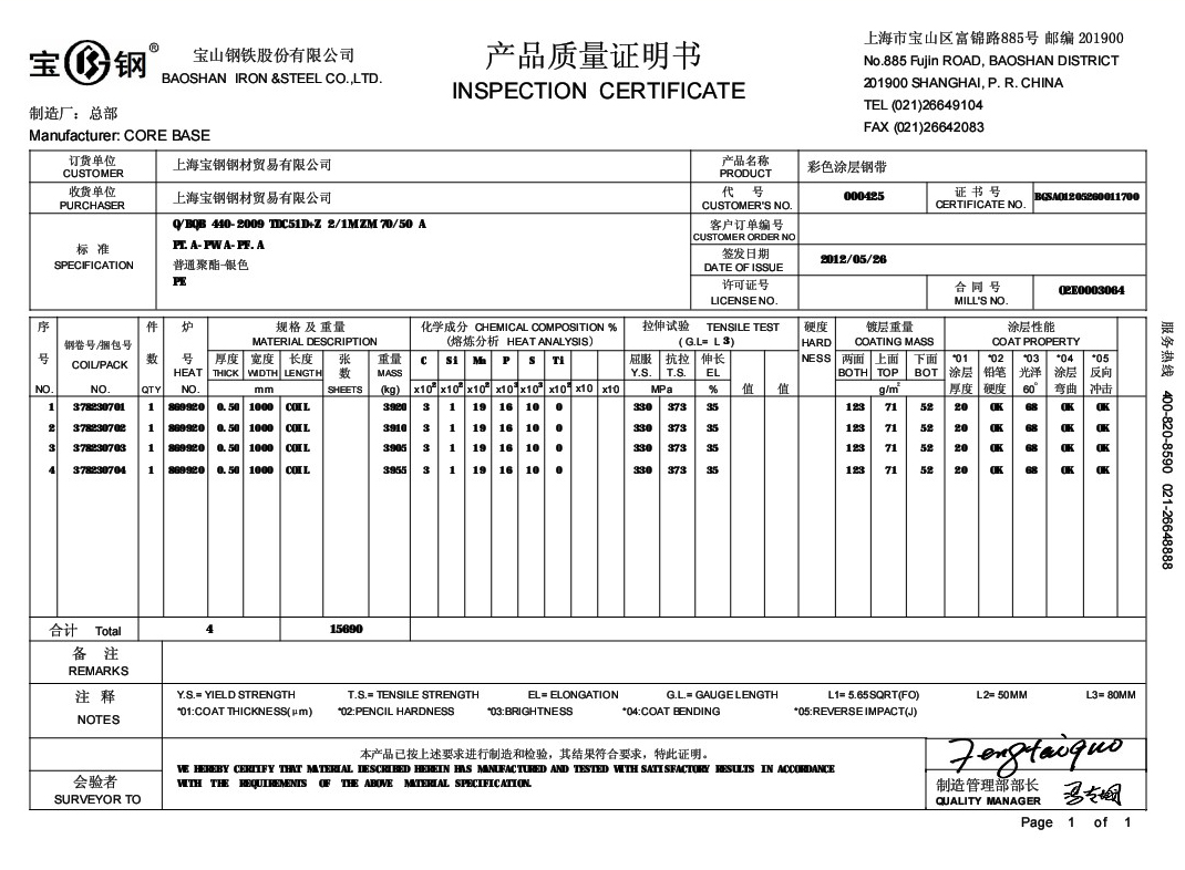 我公司長(zhǎng)期經(jīng)銷(xiāo)上海寶鋼(總部)、寶鋼黃石、臺(tái)灣燁輝、聯(lián)合鐵鋼、馬鋼、澳洲BHP(博思格)等國(guó)內(nèi)外各大鋼廠(chǎng)的:彩涂卷-彩鋼板卷、鍍鋁鋅、熱鍍鋅、冷軋、熱軋、電工鋼等鋼鐵產(chǎn)品。在長(zhǎng)期銷(xiāo)售過(guò)程積我們累了豐厚的產(chǎn)品知識(shí)。特別是在如:PVDF氟碳彩鋼卷、HDP高耐候彩鋼板、SMP硅改性彩涂卷、HPC自潔彩鋼板,及抗靜電彩鋼板等高端涂鍍產(chǎn)品方面,有著非常專(zhuān)業(yè)的特長(zhǎng)和深刻研究。